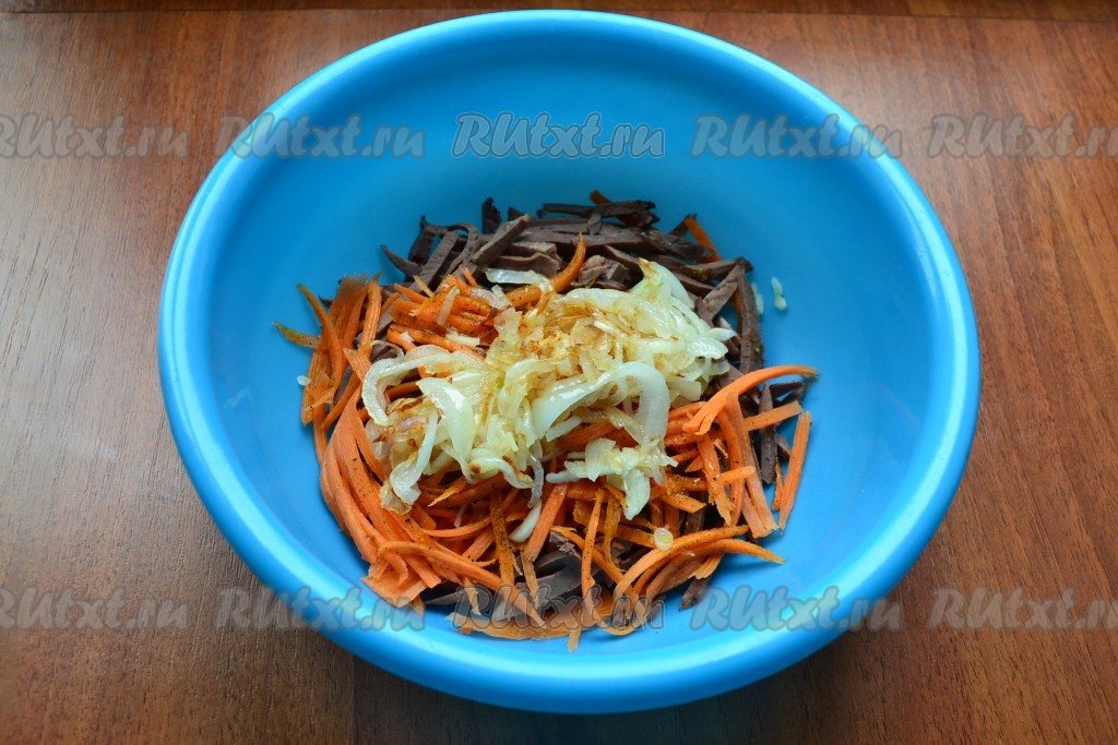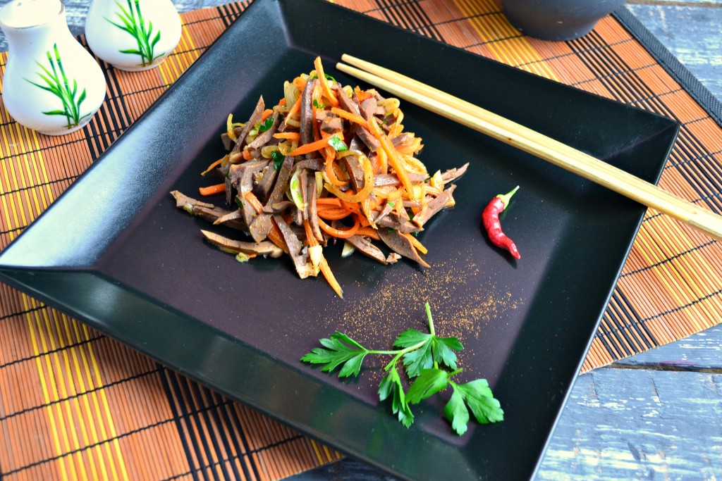 Вкуснейший салат с сердцем и морковью по-корейски подать к столу, выложив его на тарелку горкой.