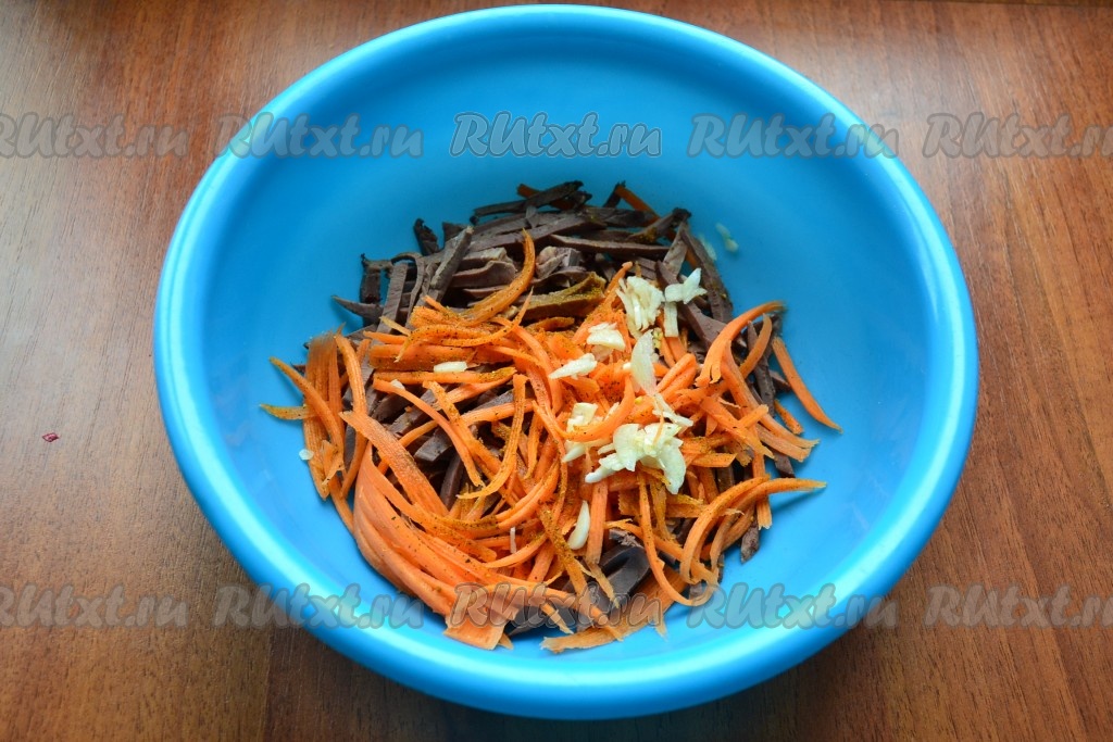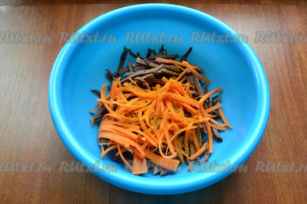 Добавить очищенную морковь, натертую на терке для корейской моркови, всыпать приправу.
