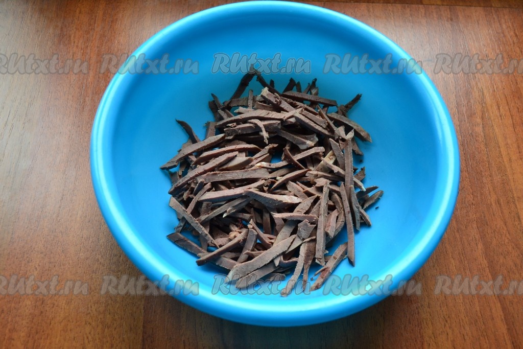 Нарезать сердце тонкой соломкой или тонкими брусочками.