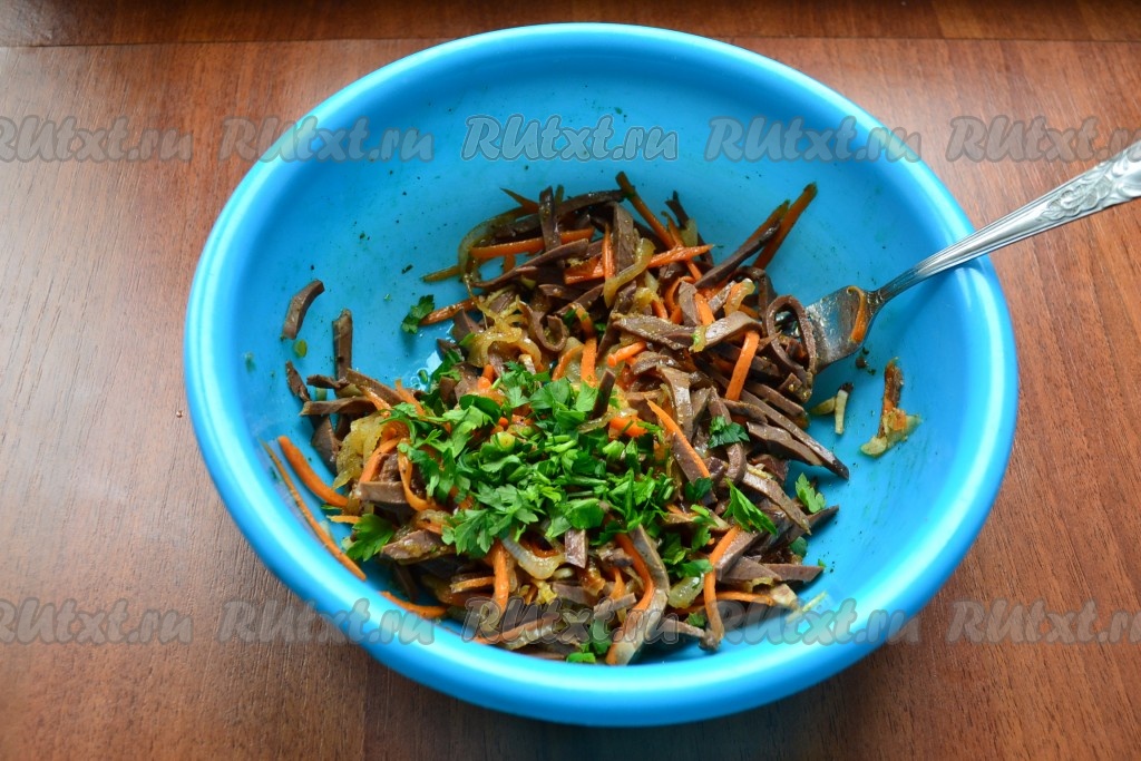 Сразу же салат перемешать. Далее добавить в корейский салат из сердца измельченную петрушку, еще раз перемешать, если нужно, досолить и дать настояться минут 30 в прохладном месте.