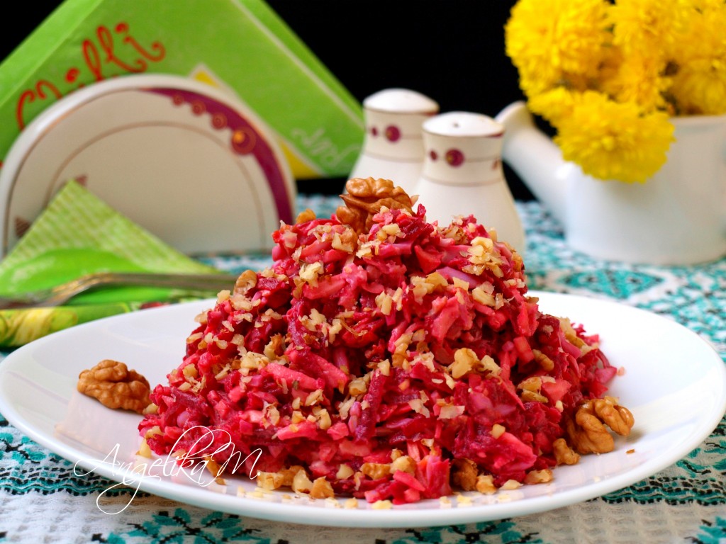 Выложить вкусный, сытный салат из свеклы с яйцом, сыром и чесноком на плоскую тарелку горкой, посыпать оставшимися орехами и подать к столу.