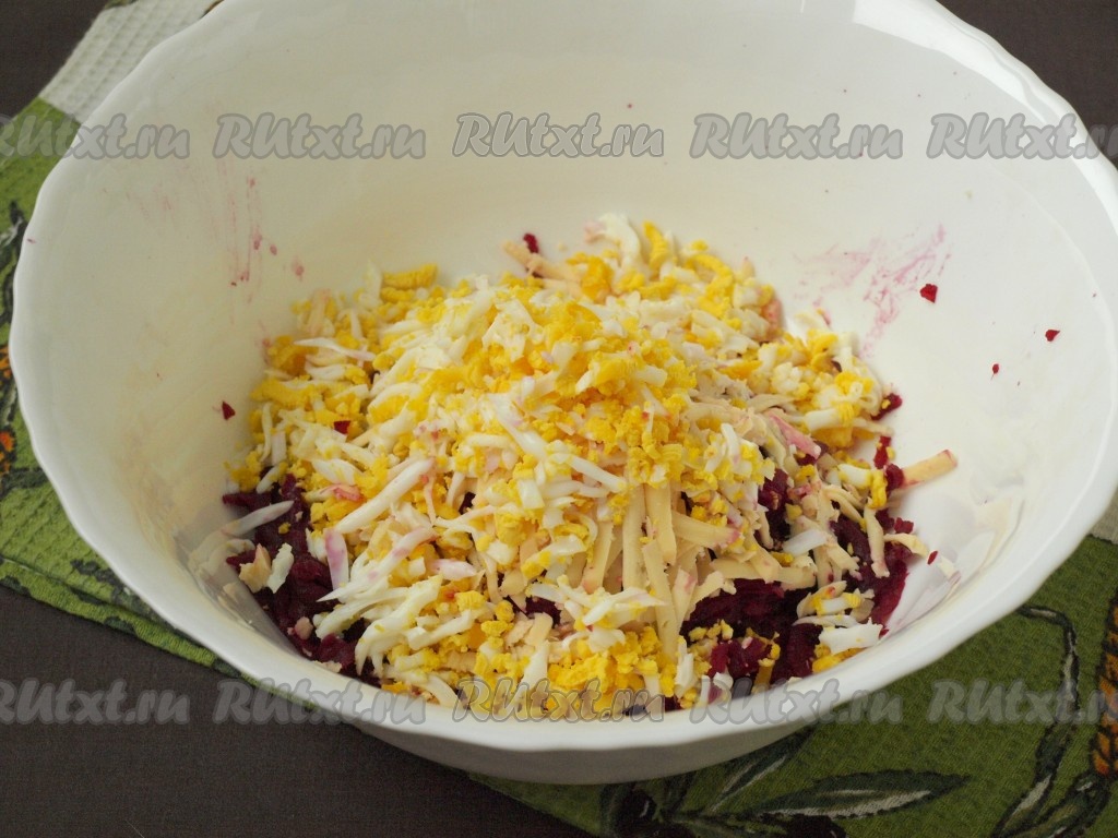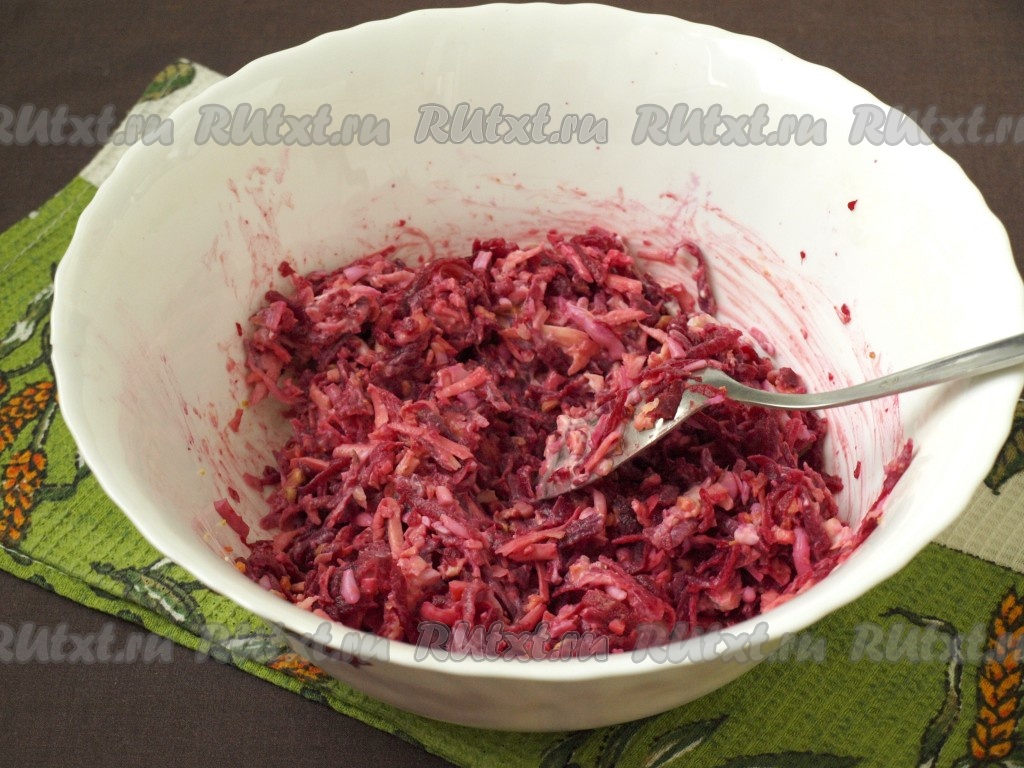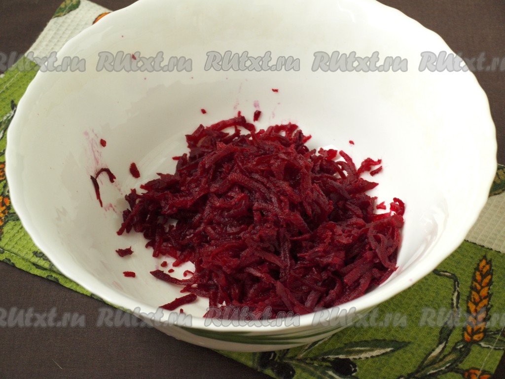 Варёную свеклу очистить и натереть на средней тёрке в глубокую миску.