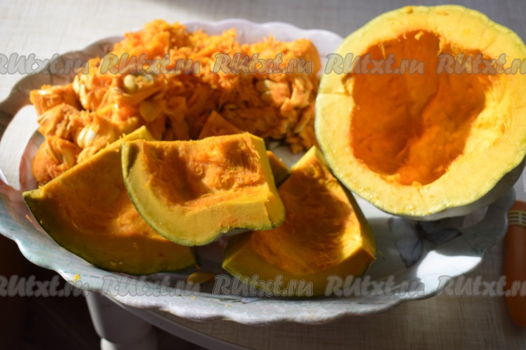Нарезать тыкву на кусочки и очистить от кожуры.