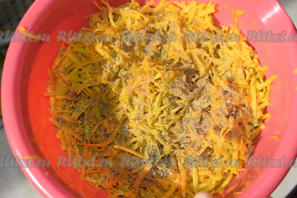 Натереть тыкву на крупной терке, посолить, поперчить и добавить специи.