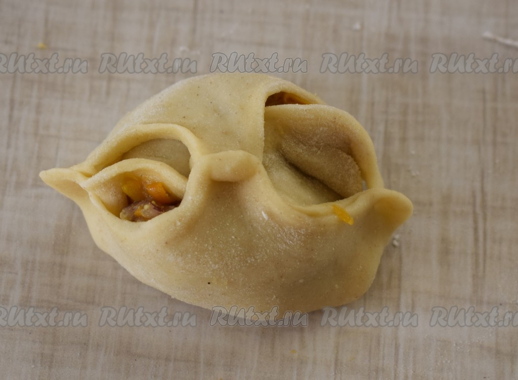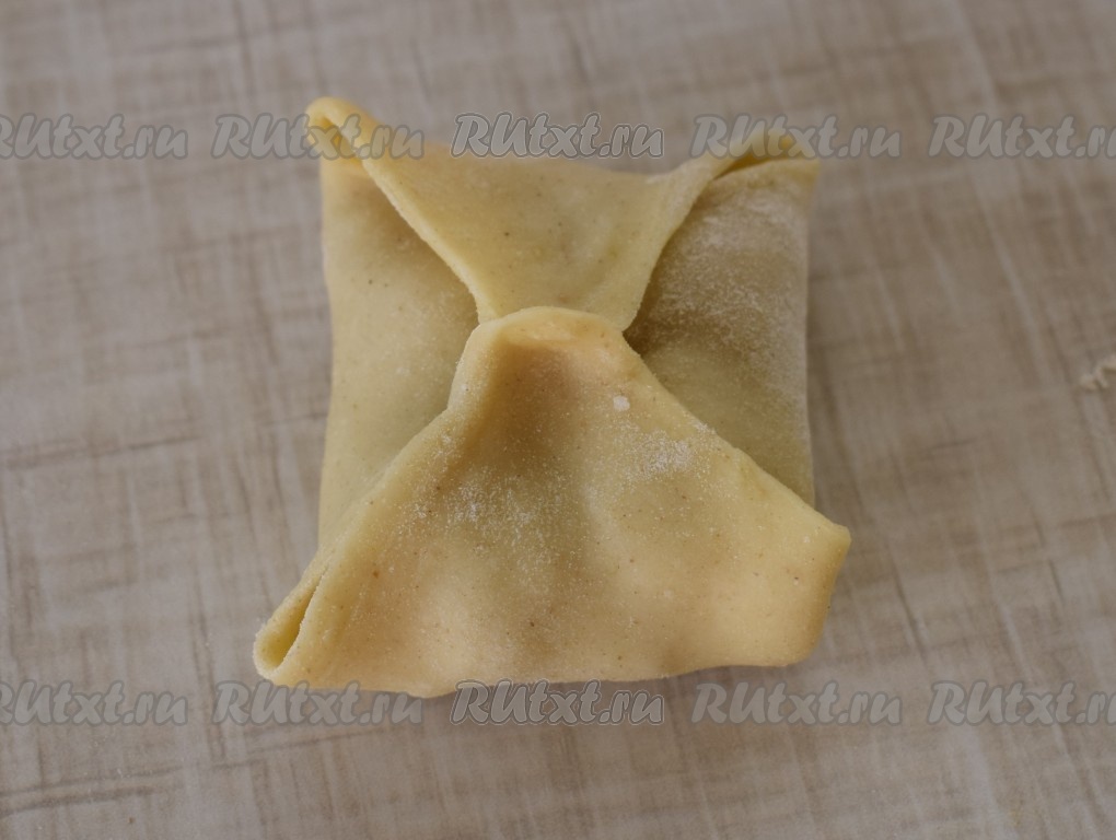 Соединяем (защипываем) противоположные стороны квадрата между собой (как на фото), таким образом формируя заготовки мантов.