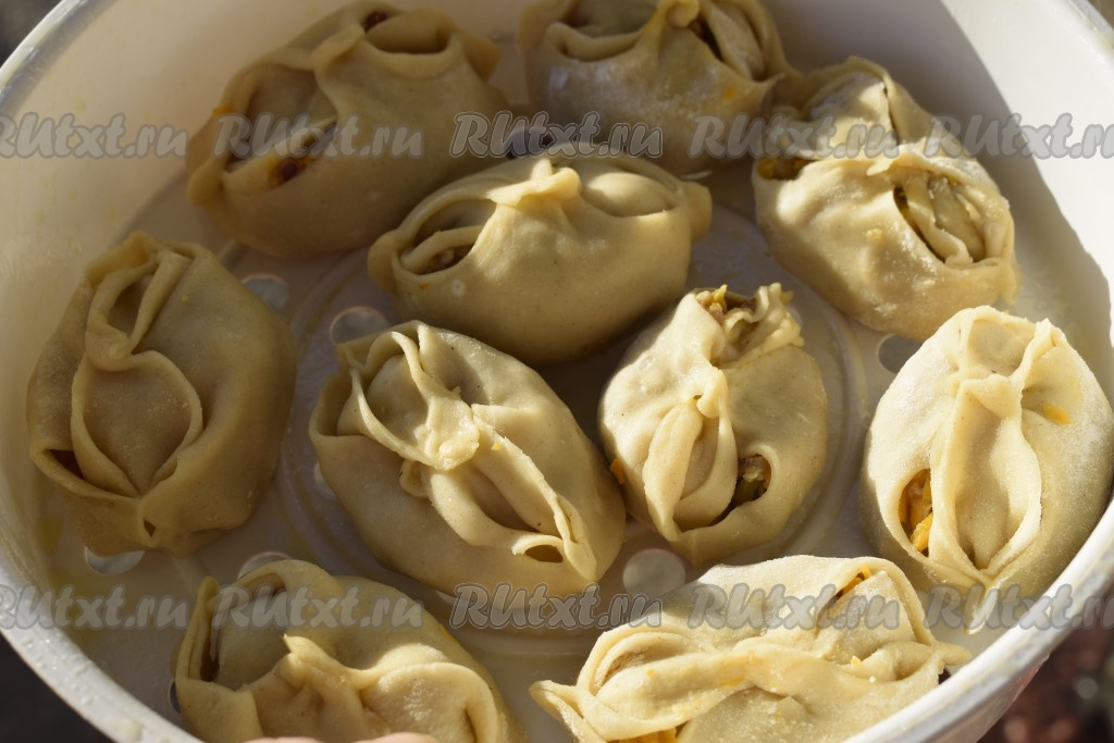 Далее открываем крышку, смазываем манты кусочком сливочного масла и закрываем крышку на 2 минуты. Затем достаем готовые ароматнейшие манты с тыквой и фаршем, выкладываем их на тарелку.