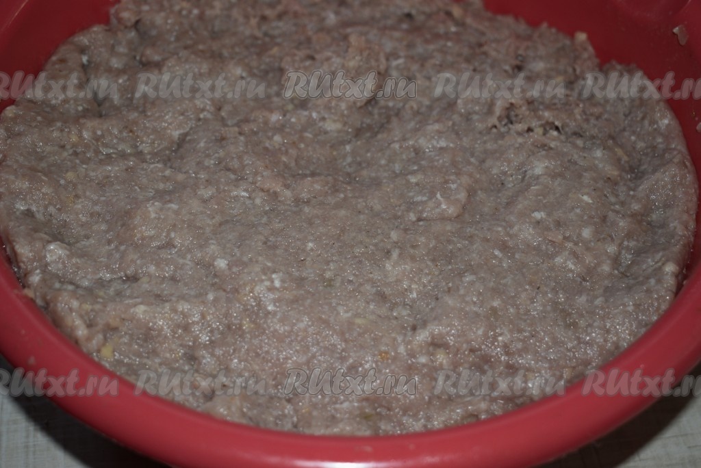 Из мяса и очищенного лука приготовить фарш, прокрутив все ингредиенты на мясорубке или мелко измельчить ножом, посолить, поперчить. Хорошо перемешать получившийся мясной фарш.