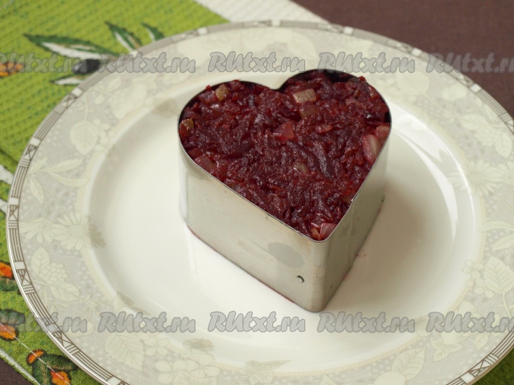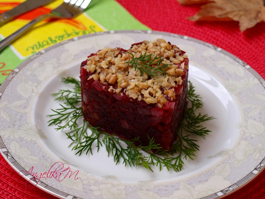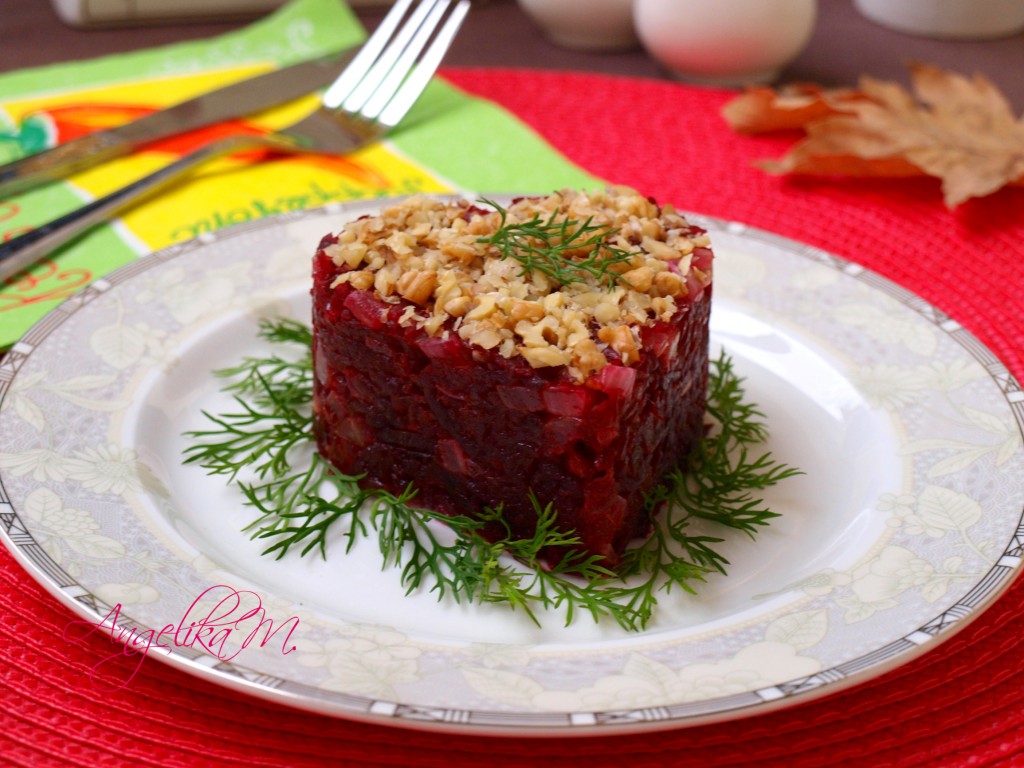 Сверху я присыпала салат измельчёнными грецкими орехами, но это уже дело вкуса. Даже без орехов салат из свеклы с жареным луком получается очень вкусным.