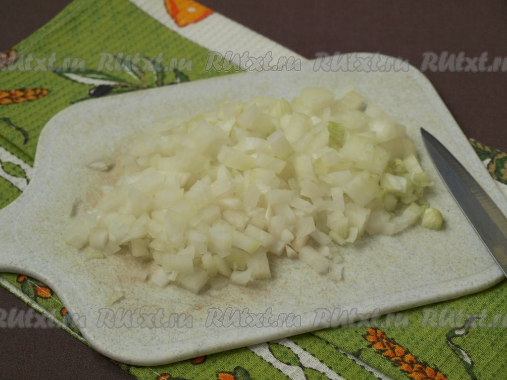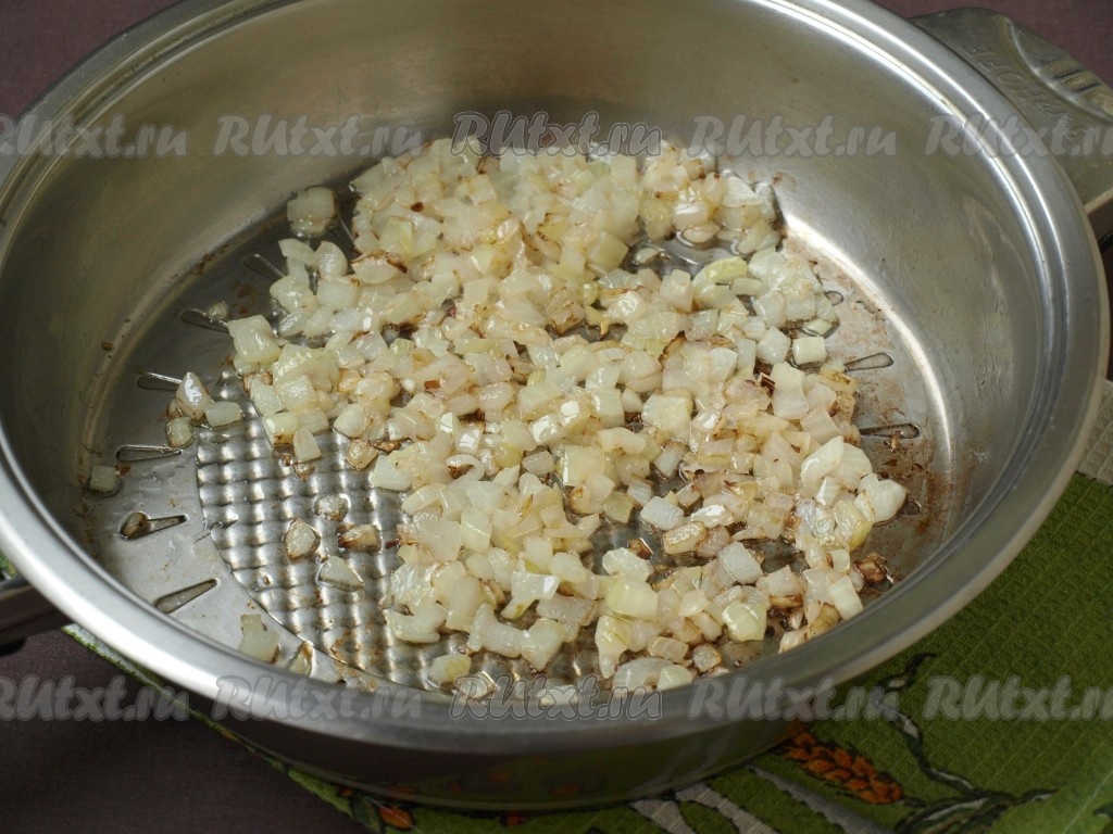 Разогрев в сковороде подсолнечное масло, выложить лук и обжарить на небольшом огне до золотистого цвета, иногда перемешивая.