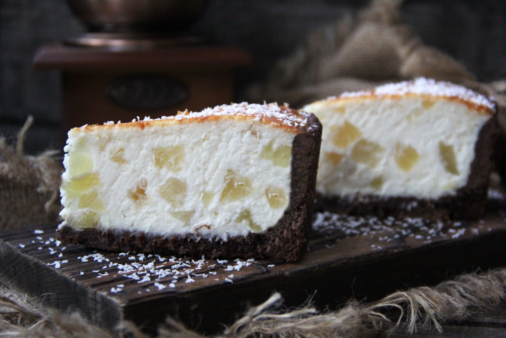 Испечь чизкейк в домашних условиях не сложно. Я хочу предложить интересный рецепт чизкейка из творога с кокосовой стружкой и кусочками ананаса (можно взять и другие консервированные фрукты). Выпекается он в духовке и получается очень вкусным, нежным и красивым. Шоколадная песочная основа этого чизкейка и нежное суфле из творога прекрасно сочетаются между собой и не оставят никого равнодушным. Обязательно приготовьте этот восхитительный творожный чизкейк!
