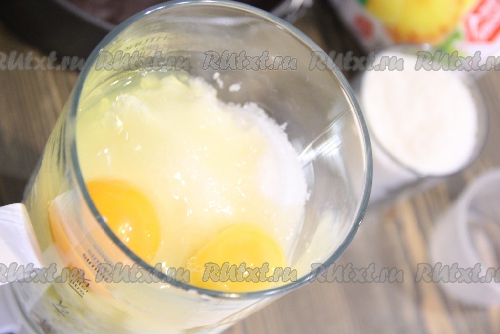 В чашу блендера выложить творог, сахар и яйца.