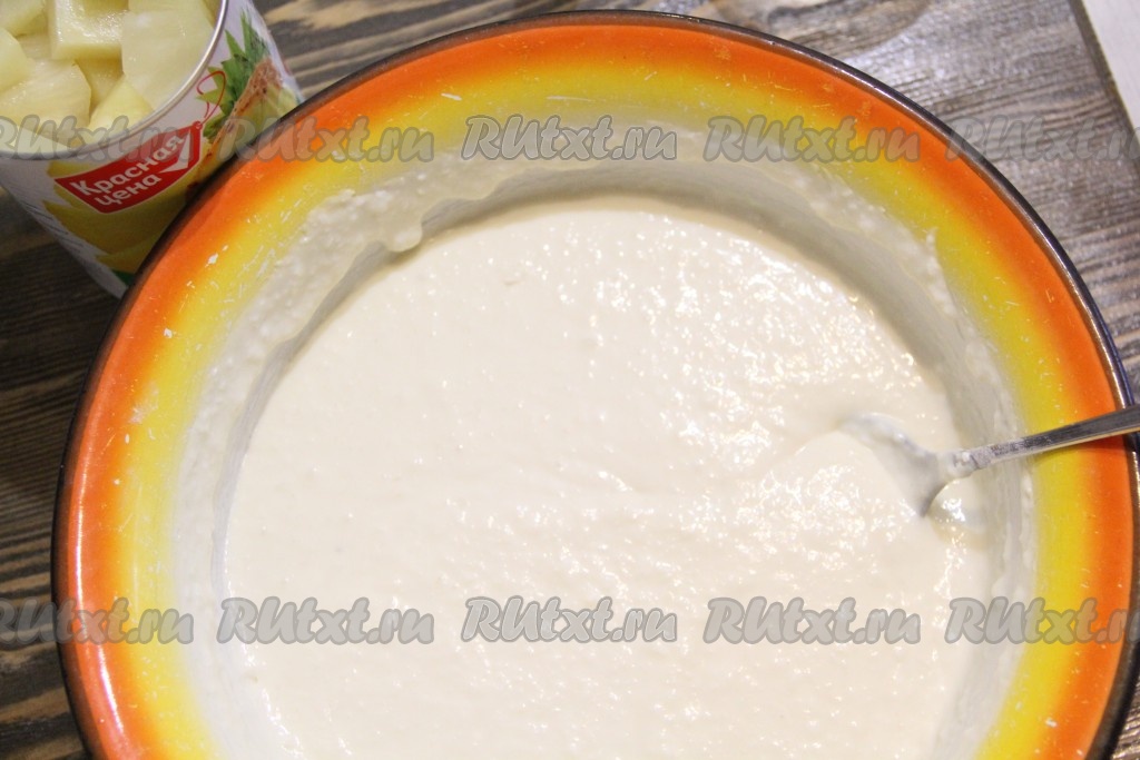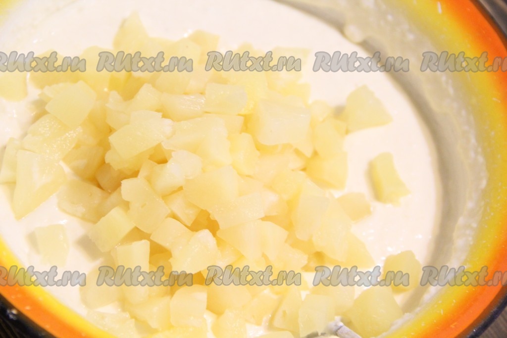 Затем добавить кусочки ананаса и аккуратно перемешать.
