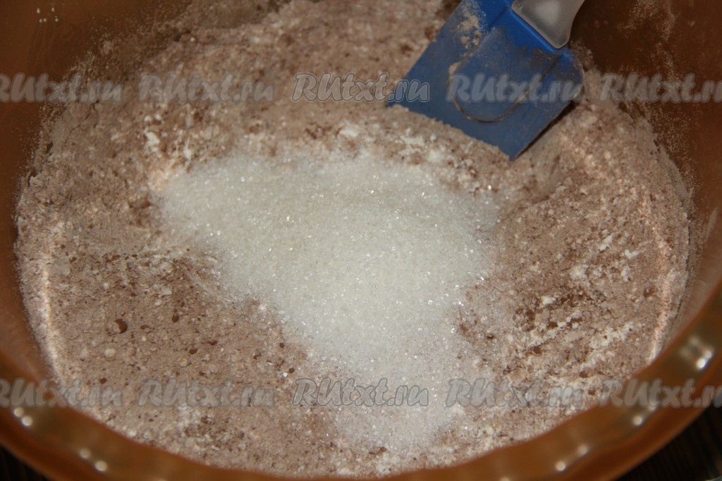 Слегка перемешать, затем добавить разрыхлитель и сахар.