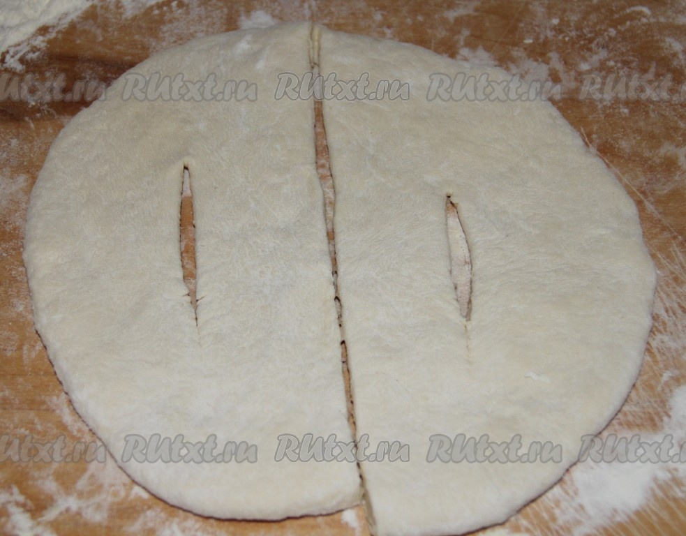 Разделить тесто на три равные части. Из каждой части раскатать коржик, перерезать пополам и каждую половинку перерезать по середине.