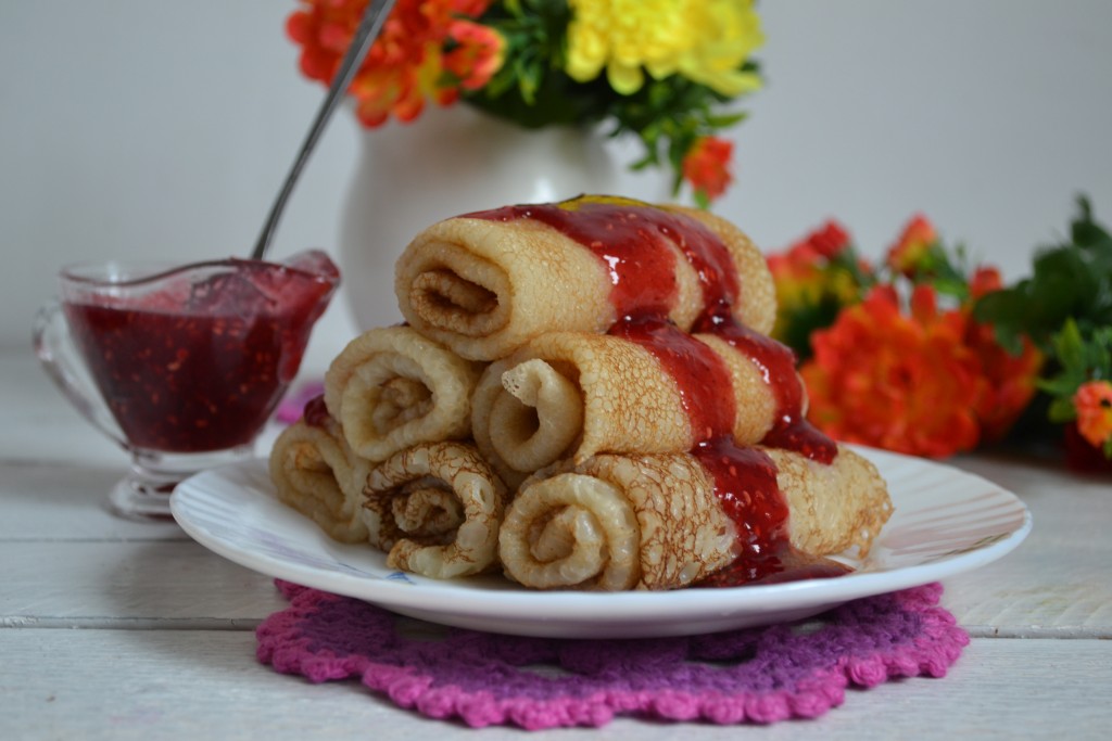В такие блины можно завернуть любую начинку, а можно просто смазать сиропом или медом, свернуть трубочкой или конвертиком и подать на стол.