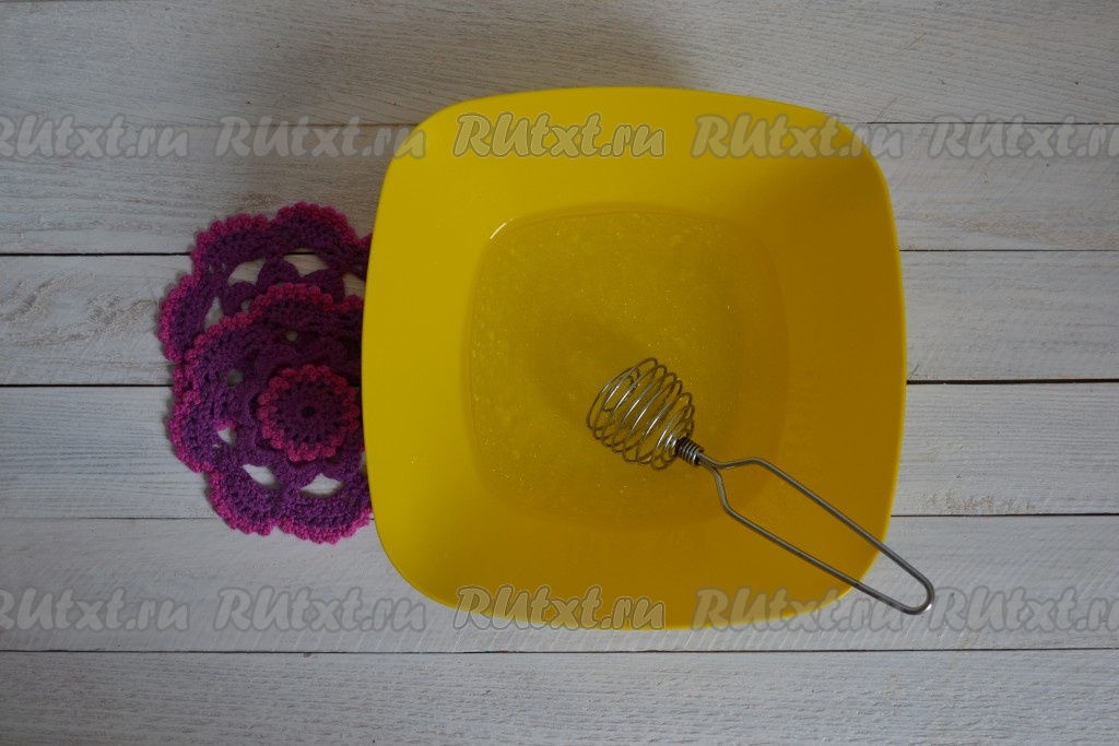 Размешивать венчиком до тех пор, пока не растворятся последние кристаллы. Затем влить 3 столовые ложки растительного масла, перемешать.