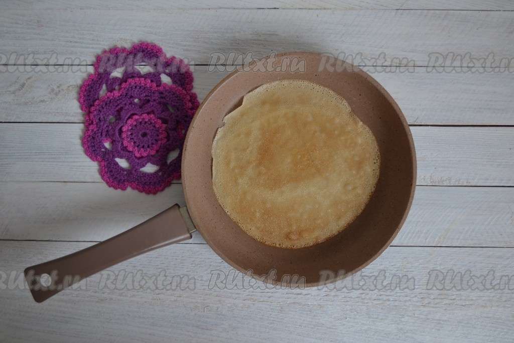 И так один за другим пожарить все блины, пока не закончится тесто. Сковороду смазывать растительным маслом перед выпеканием каждого блинчика не нужно, только по мере необходимости.