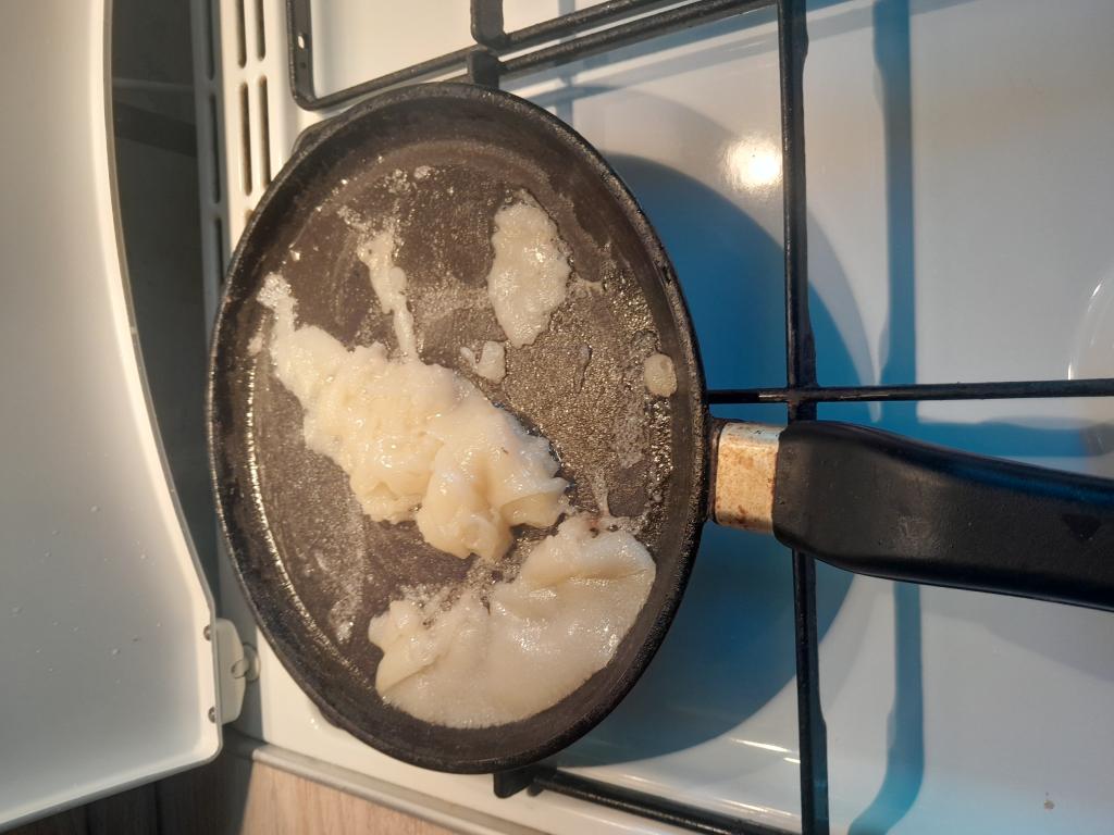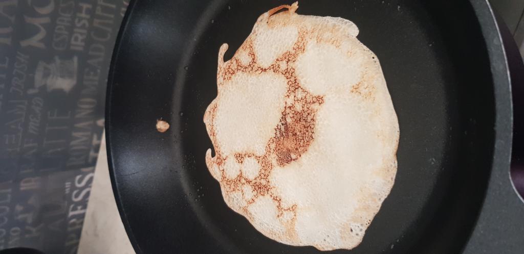 Аккуратно поддеть край блина и быстрым движением руки перевернуть его на другую сторону, обжарить 30 секунд и снять со сковороды.