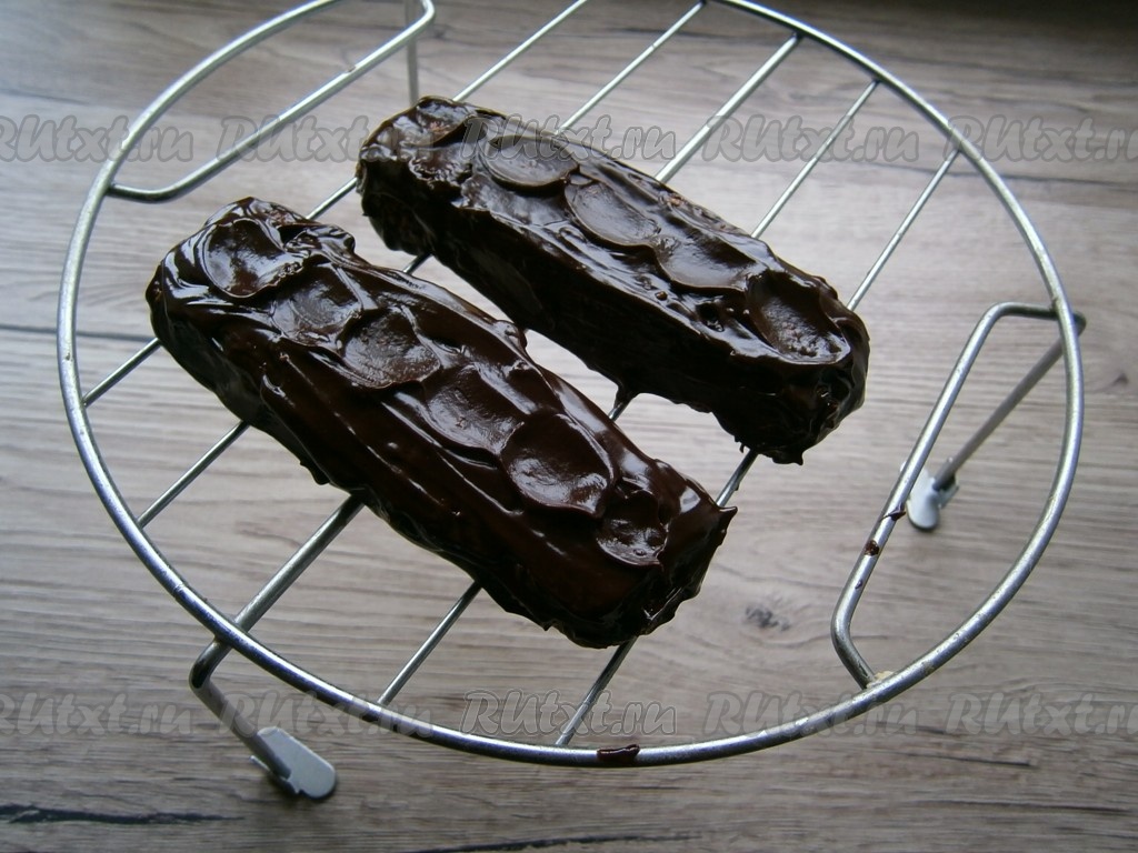 Растопить на водяной бане шоколад, дать чуть остыть. Дно батончиков (или конфет) окунуть в шоколад и разместить их на решетке. Затем полить шоколадом их сверху. Я смазывала ложкой, попался какой-то не тот шоколад, растопившись он был густым. Если такое произойдет, нужно в шоколад добавить немного горячих сливок, которых у меня не оказалось под рукой.