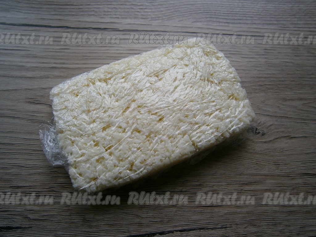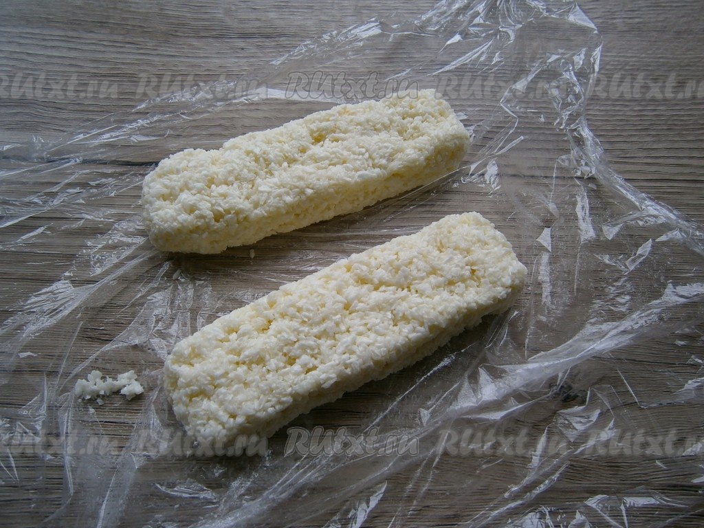 Тщательно перемешать получившуюся массу и выложить на пищевую пленку, помогая ножом сформировать прямоугольник.