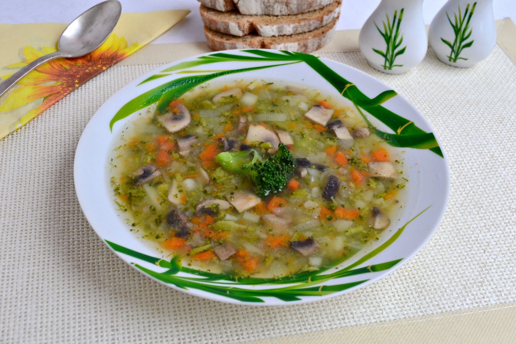 Капуста брокколи очень полезна для нашего организма, в ней содержится много витаминов. Её можно тушить, варить, запекать, готовить с ней салаты, а также свежевыжатый сок. Предлагаю вам приготовить суп с брокколи и шампиньонами - простой, но в тоже время полезный, очень вкусный и сытный. Шампиньоны в супе отлично дополняют почти нейтральный вкус брокколи. Попробуйте, супчик действительно очень вкусный!