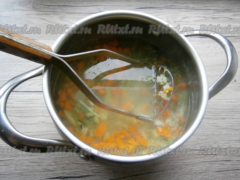 Затем все овощи в кастрюле немного размять толкушкой.