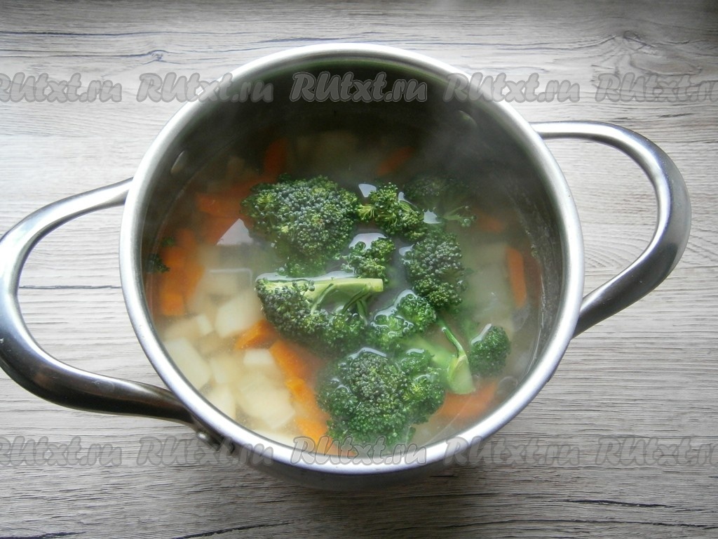 Когда овощи в кастрюле будут готовы, добавить к ним брокколи, варить далее суп 10 минут на небольшом огне.