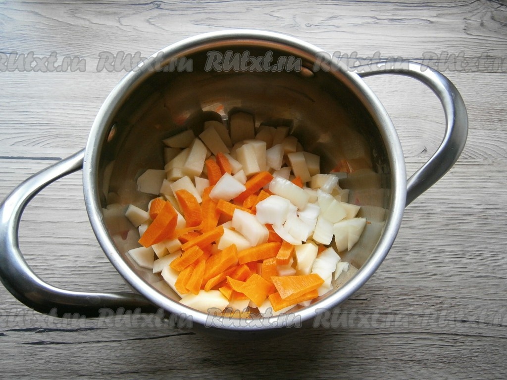 Морковь, лук и картофель очистить. Картошку нарезать кубиками, морковь и лук - кусочками. Поместить нарезанные овощи в кастрюлю, влить воду и поставить на огонь, довести до кипения и уменьшить огонь. Варить овощи, посолив воду, 30 минут с момента закипания.