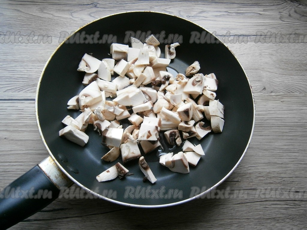 Шампиньоны нарезать кусочками, выложить на разогретую с растительным маслом сковороду, обжарить их на среднем огне в течение 5 минут, периодически перемешивая.