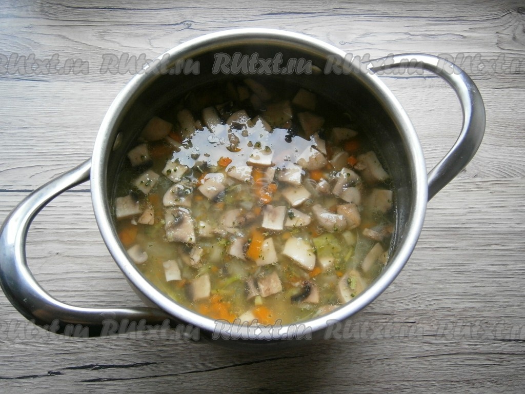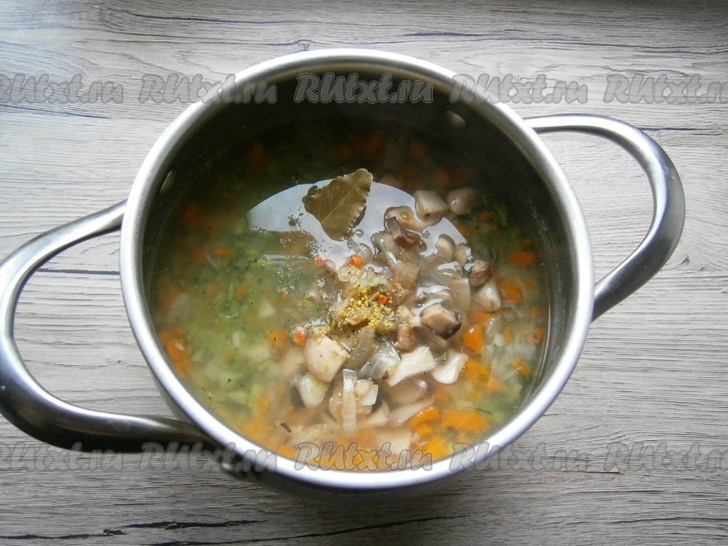 В суп добавить обжаренные шампиньоны, специи и лавровый лист.
