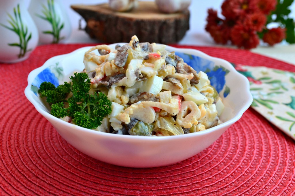 Интересный и очень вкусный салат с жареными крабовыми палочками и грибами выложить в салатник, украсить веточкой петрушки и подать к столу.