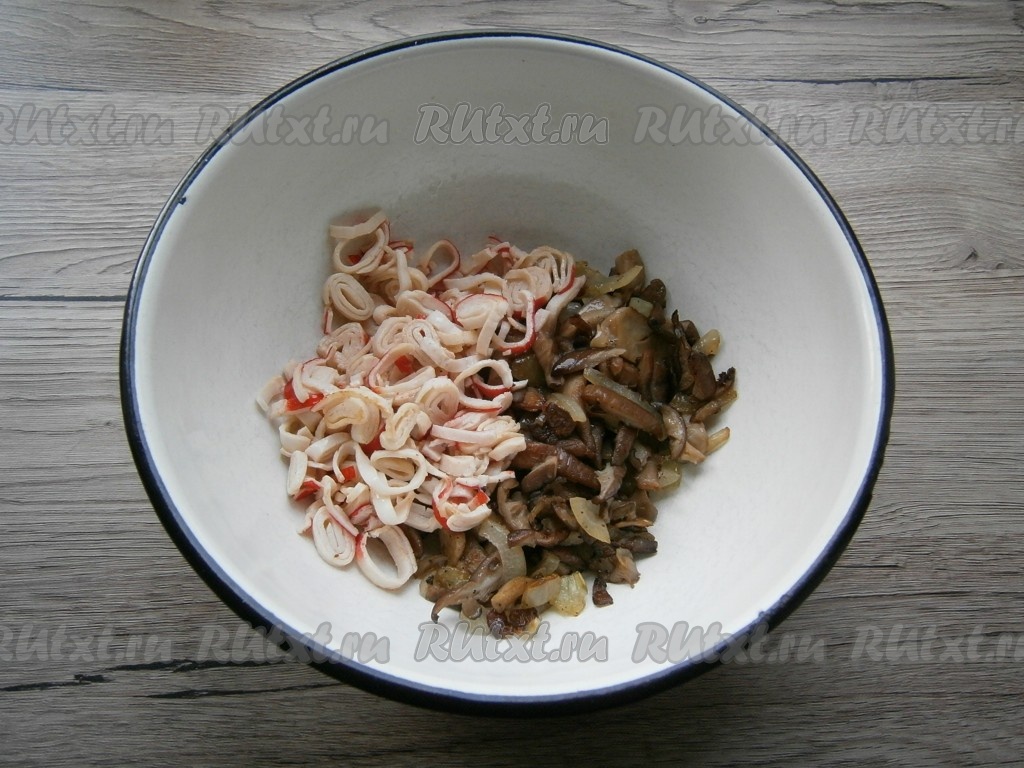 Жареные крабовые палочки остудить, выложить в миску, добавить к ним остывшие грибы.