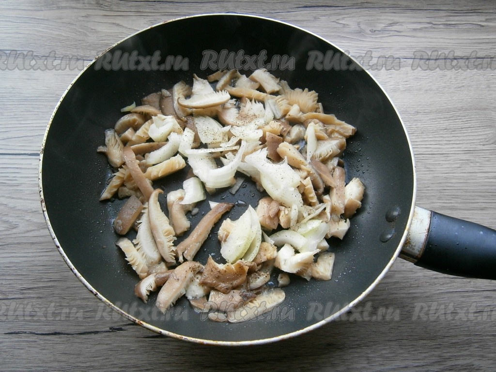 Жарить грибы с луком на среднем огне 7-10 минут, периодически помешивая, немного посолить и поперчить. Грибочки, обжаренные с луком, переложить на тарелку и дать им остыть.