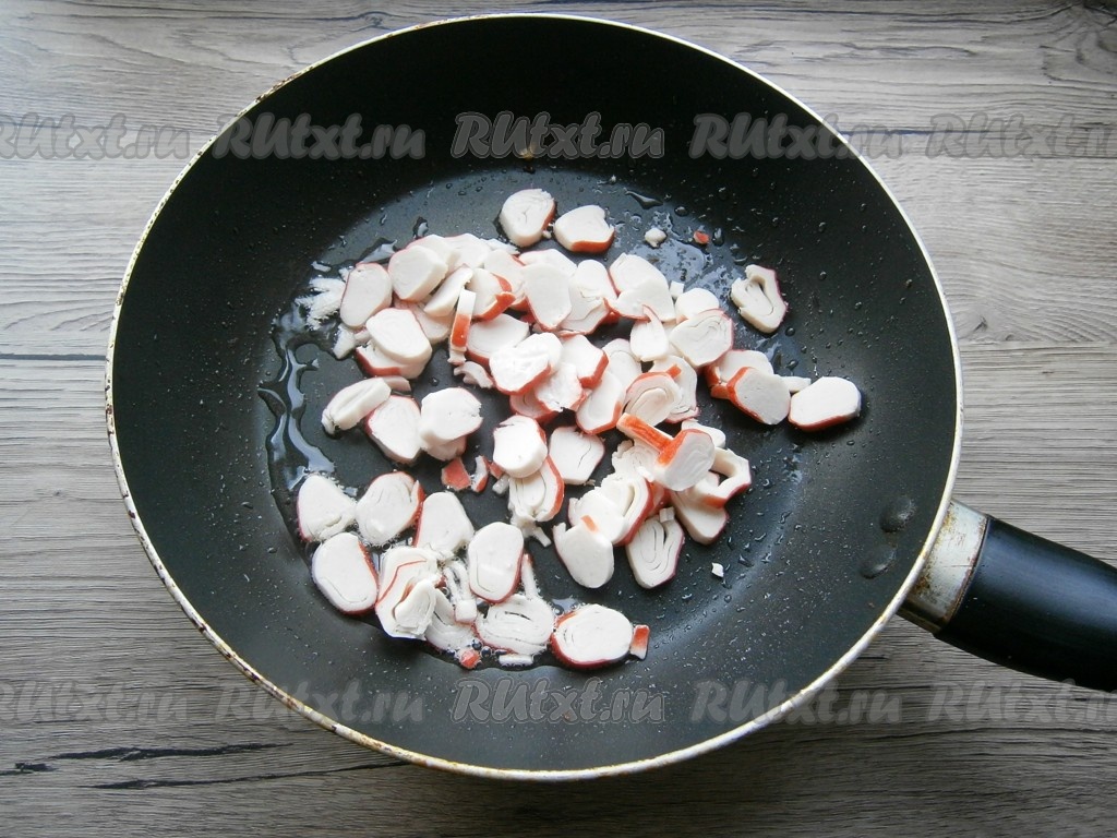 В ту же сковороду влить немного растительного масла и выложить нарезанные кружочками крабовые палочки.