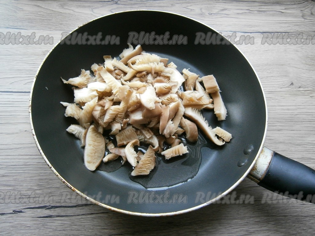 Грибы, нарезанные кусочками, выложить на сковороду, разогретую с растительным маслом.