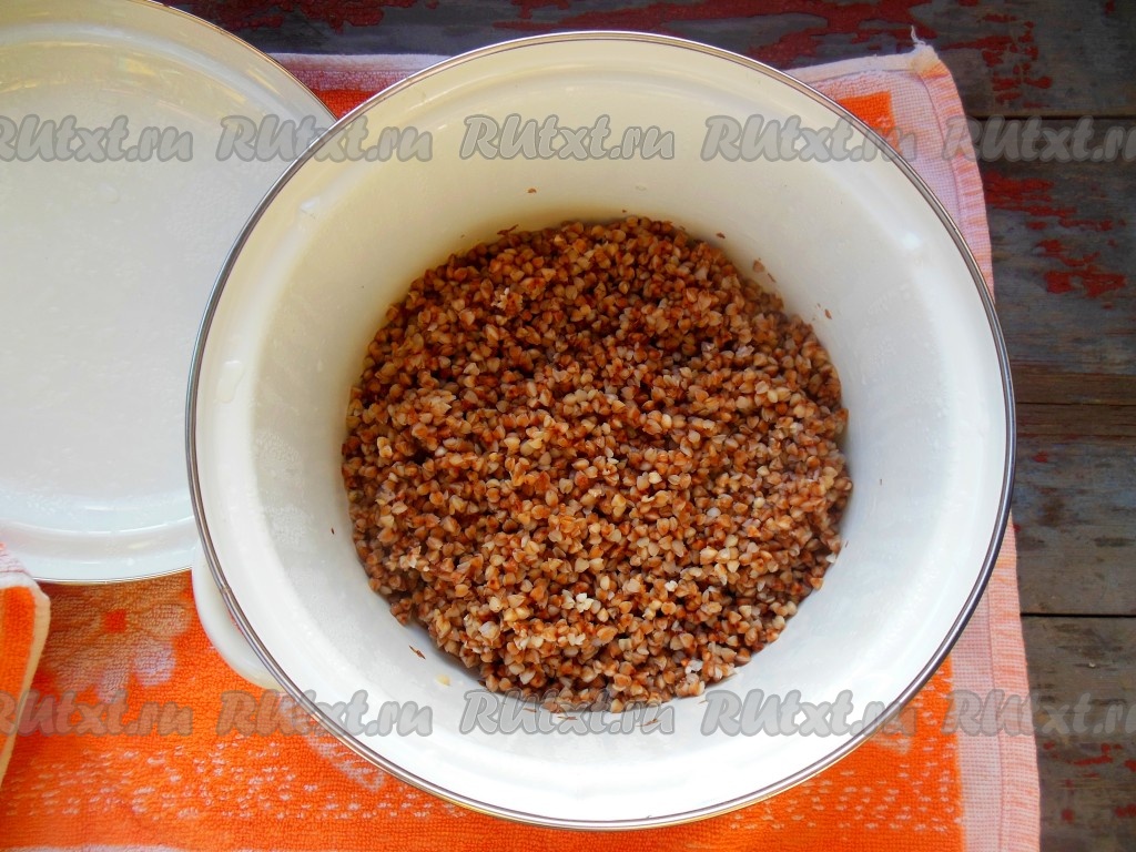 Кастрюлю с гречкой накройте крышкой и хорошенько укутайте полотенцем (можно укутать и двумя полотенцами).