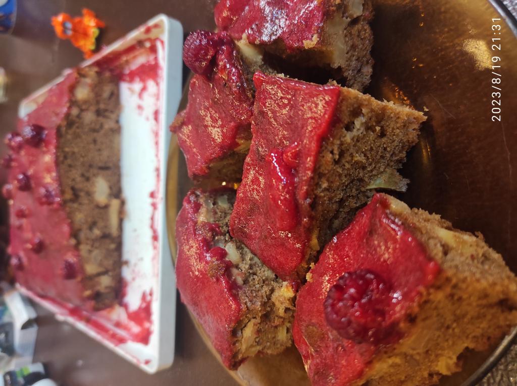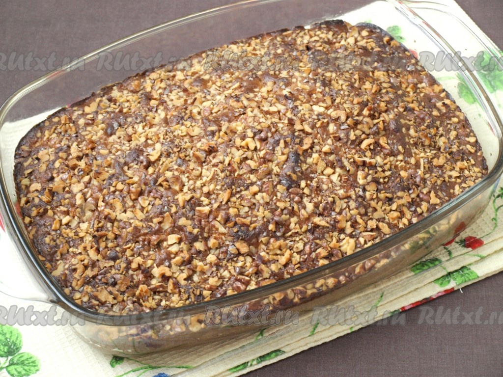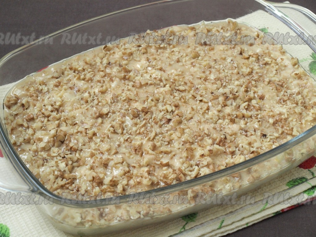 Форму для выпечки (у меня размер формы 17 на 25 см) смазать растительным маслом, выложить тесто и разровнять лопаткой. Сверху посыпать оставшейся частью орехов.