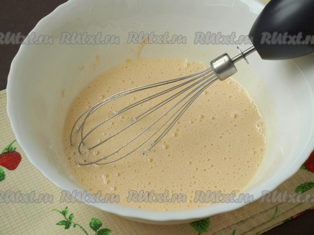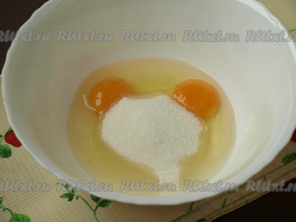 В другую миску разбить яйца, добавить сахар и затем хорошо взбить.