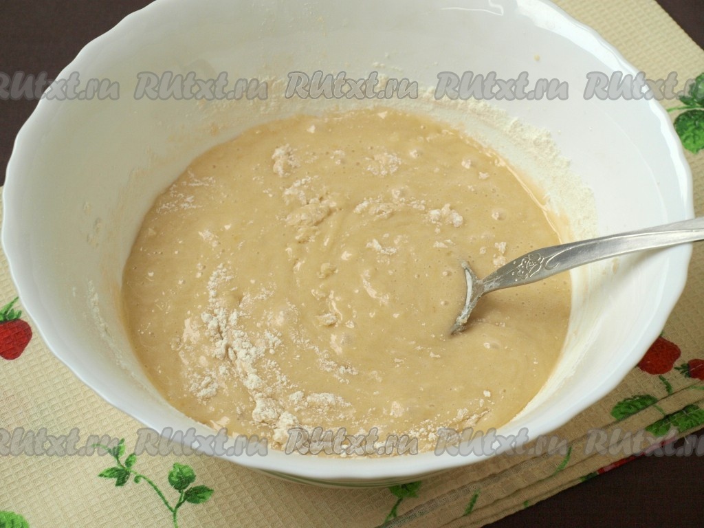 Добавить в тесто ванилин, щепотку соли и муку, смешанную с разрыхлителем и содой, тщательно перемешать.