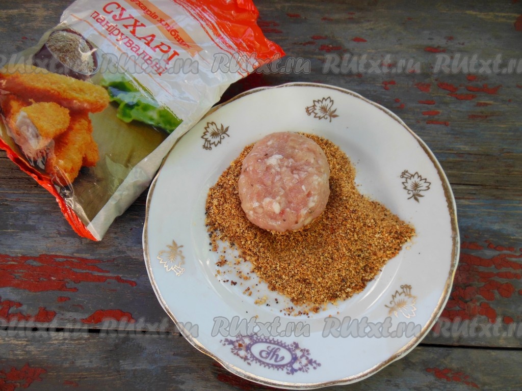 Смочив руки водой, сформируйте из фарша кролика котлеты. Придавая котлеткам форму, оббивайте фарш из ладошки в ладошку. Затем обваляйте каждую котлетку в панировочных сухарях.