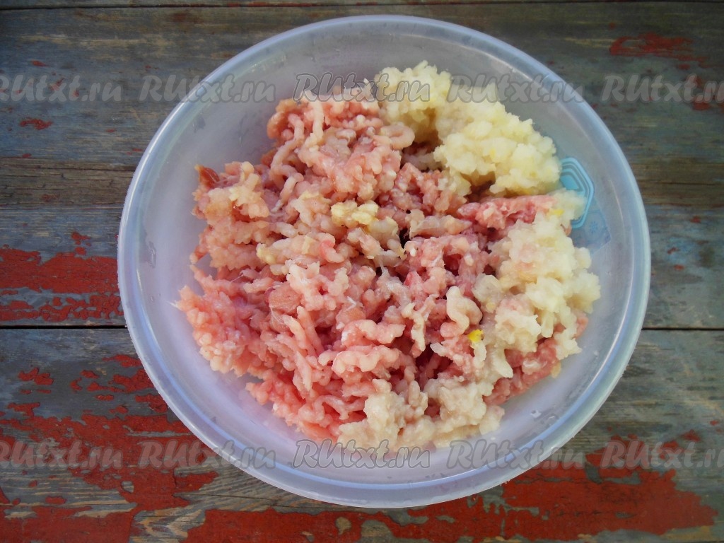 К полученной массе добавьте лук и чеснок, измельченные через мясорубку. Для более яркого вкуса, лук можно мелко нарезать и слегка обжарить.