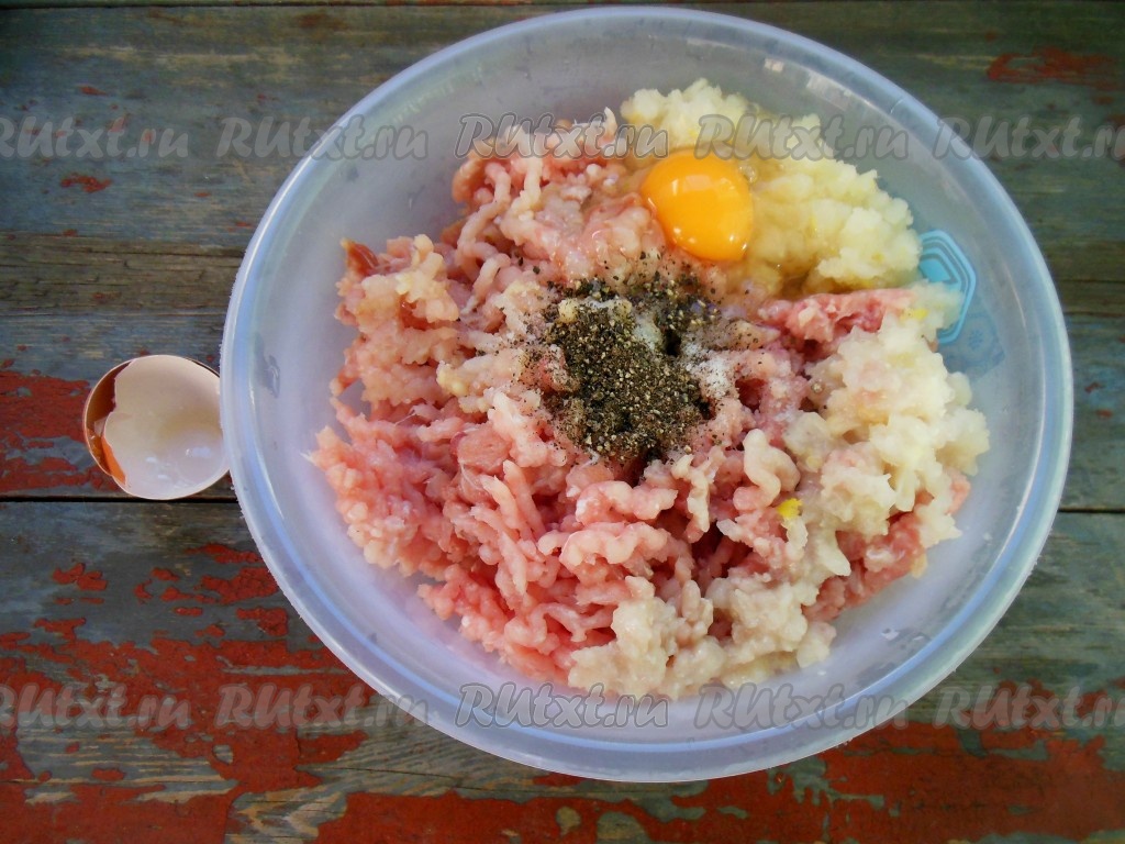 К получившемуся фаршу добавьте яйцо, свежемолотый черный перец и соль, тщательно перемешайте. Накройте фарш пленкой, уберите в холодильник на 7-10 минут.