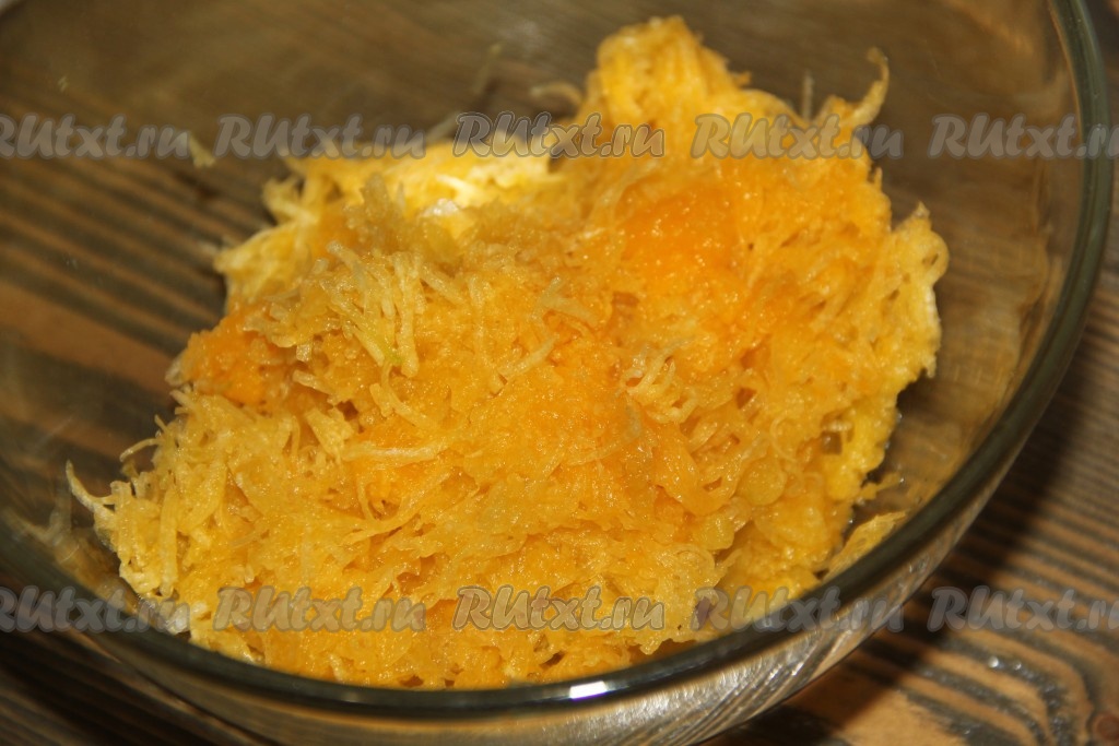 Тыкву, очищенную от кожуры и семечек, натереть на мелкой тёрке. Для этого пирога нам понадобится 300 грамм мякоти тыквы.