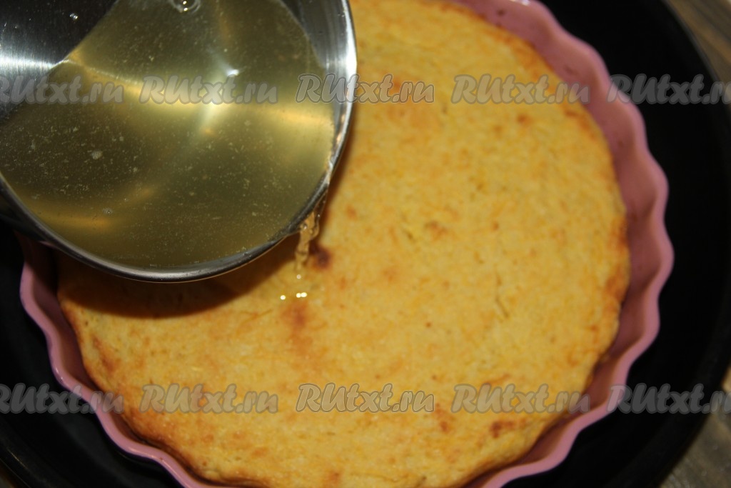 Тыквенный пирог, приготовления с манкой без добавления муки, достать из духовки и полить сиропом.