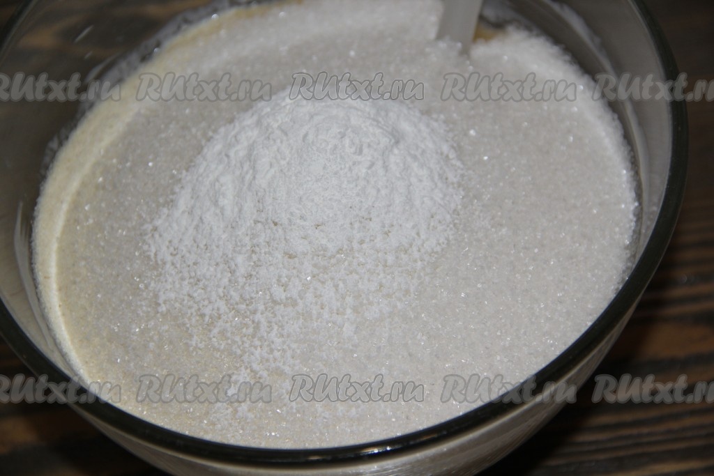 Выложить тесто в форму для выпечки, смазанную растительным маслом, разровнять. Поставить форму в духовку, разогретую до 200 градусов, и выпекать пирог минут 45 (готовность можно проверить сухой лучинкой - при покалывании готового пирога лучинка должна остаться сухой).