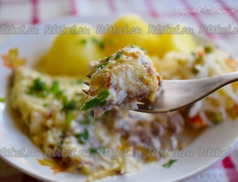 Для приготовления соуса смешиваем яичные желтки, сметану, молоко (или бульон), солим и перчим по вкусу.