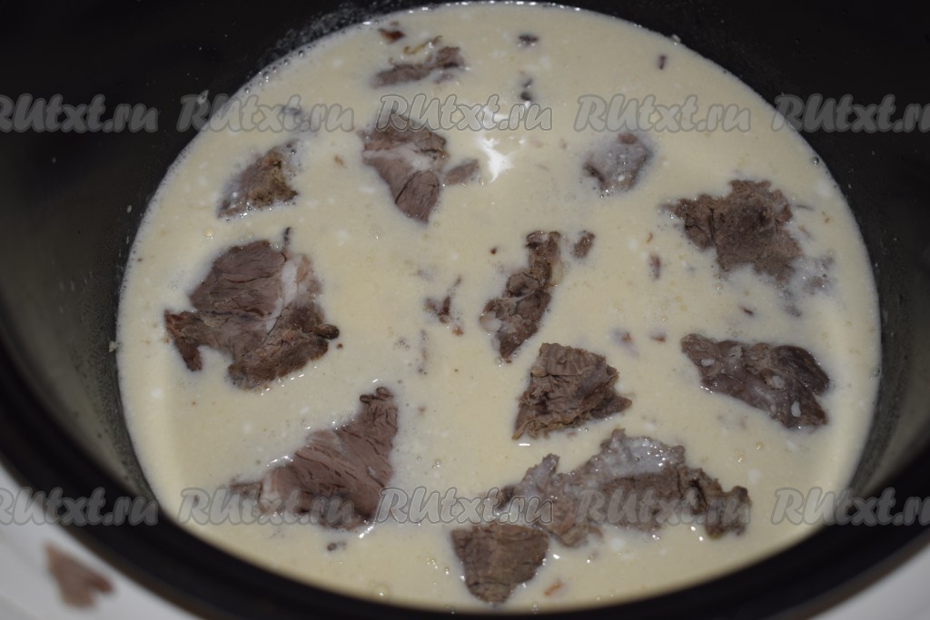 Когда мука подрумянится, выкладываем к ней получившийся сметанный соус и кусочки говядины, закрываем крышку мультиварки.