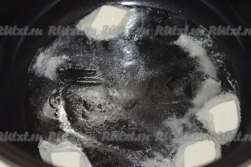 Мультиварку включаем на режим "Жарка" на 15 минут, выбираем вид продукта "Рыба". Наливаем в чашу мультиварки растительное масло и добавляем к нему сливочное масло.