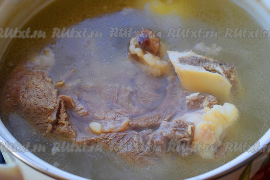 Достаем говядину из бульона. В дальнейшем этот бульон можно использовать для приготовления вкуснейшего борща или наваристого супа.