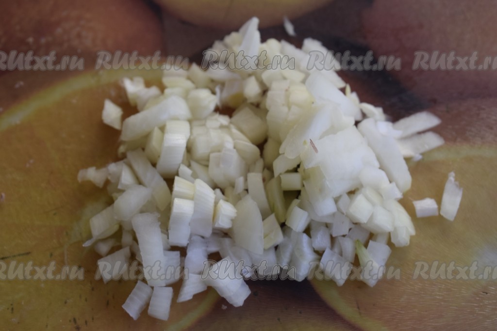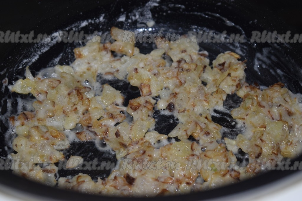 Разогреваем масло, выкладываем нарезанный лук и обжариваем его, помешивая, до прозрачности и легкого подрумянивания.